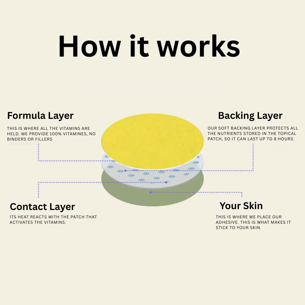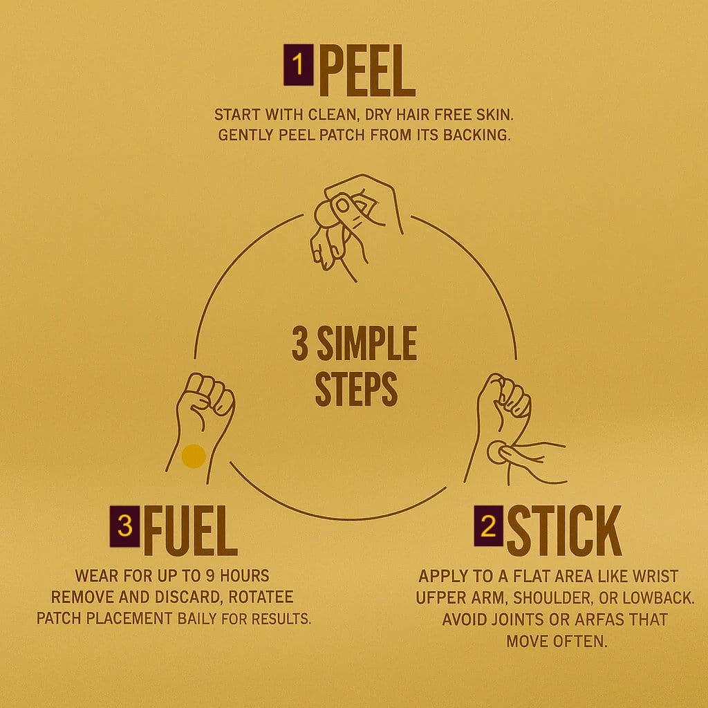 - Gentle & Non-Invasive: No pills or harsh stimulants - just a simple patch that works discreetly on your skin. keeping you energized without even noticing it.