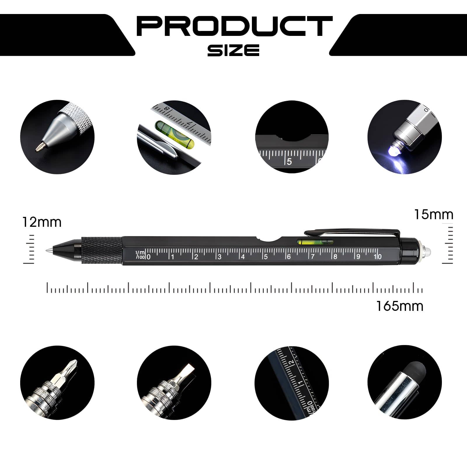 🔧 9-in-1 All-in-One Design: This compact multitool pen packs nine essential tools — LED light. ruler. stylus. bubble level. flathead & Phillips screwdrivers. twist ballpoint pen. and bottle opener (also works as a phone holder). Perfect for everyday fixes and creative work.