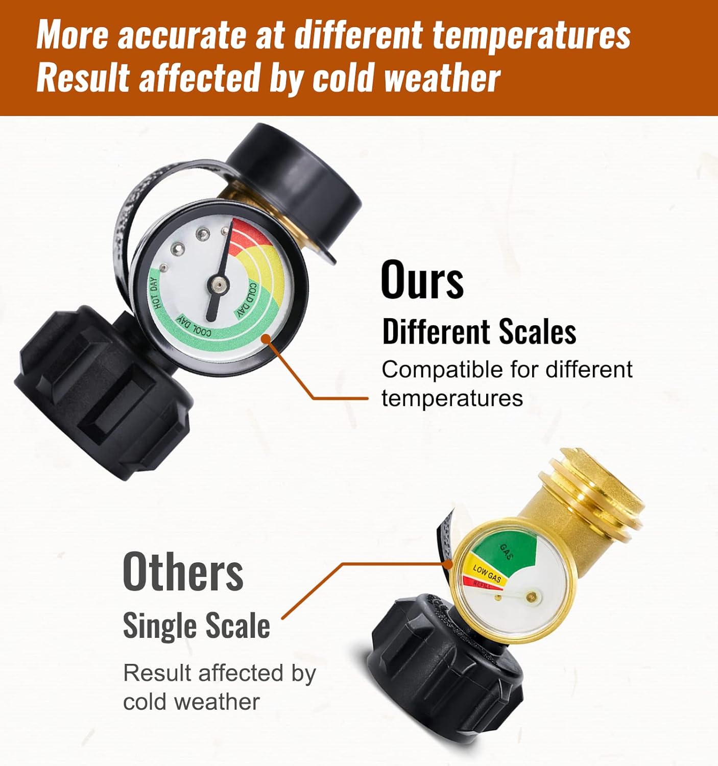 ADAPT TO DIFFERENT TEMPERATURES – As ambient temperature changes. the pressure in the tank will change. which may lead to wrong results for gas level with other normal propane gas gauges. To adapt to different climate. this PatioGem propane guage for tanks has 3 scales for hot day(≥ 68°F). cool day(≥50°F. ≤68°F) and cold day(≤50°F). always providing an accurate reading for your gas level.