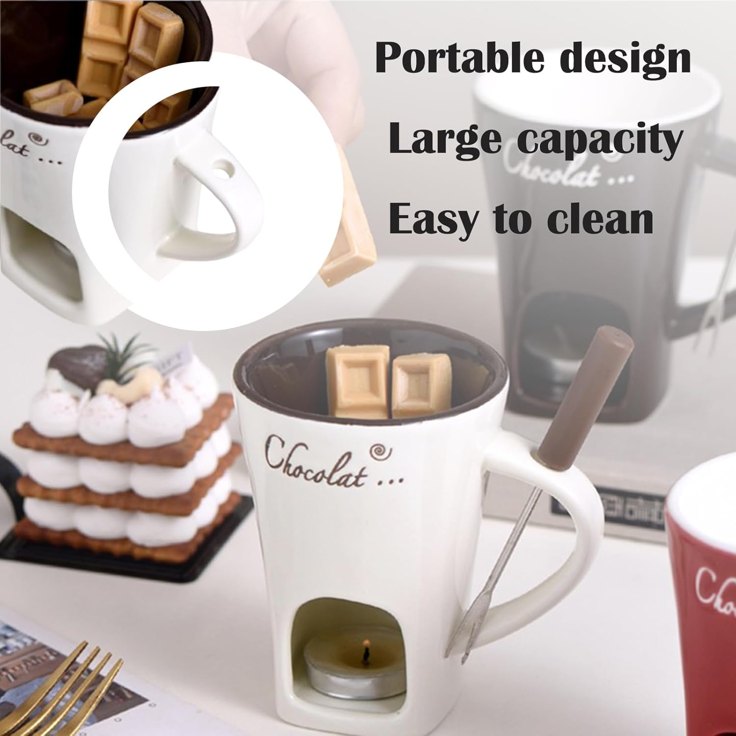 Portable design: The bottom design of the Fondue Cup accommodates small candles to ensure even heating.Designed with a comfortable handle for effortless pouring. lets you drizzle melted chocolate or cheese with precision.